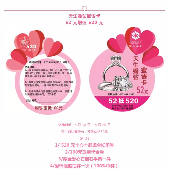 1、5.18-20日持卡到店领取硬金爱心石榴石手串一件,购十心十箭产品52元可抵520元使用,限一件商品抵用一次,与店内优惠、持卡优惠不能叠加。