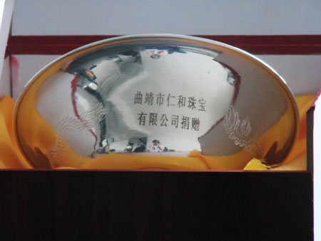 曲靖市仁和珠宝金行有限责任公司为曲靖新建的“靖宁宝塔”捐献银碗30个,祈福祖国繁荣昌盛,风调雨顺,国泰民安,祈祷仁和珠宝公司能够基业长青,生意兴隆!
