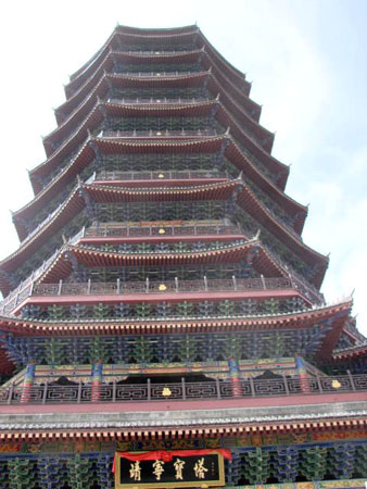 云南曲靖城历史上就无塔,2009年在曲靖城旁边的寥廓山顶,兴建了一座9级8面形仿古建筑风格的楼阁式塔,这座建筑总面积有7427平方米,高84.6米的楼阁式高塔(见照片),名曰“靖宁宝塔”(“靖”是现在的“曲靖”二字中选出的“靖”;公元225年,诸葛丞相平定南中地后,废除益州郡的名称,改称为“建宁郡”,且将建宁郡的郡治所设置在今曲靖,曲靖亦名“建宁”。“宁州”也是曲靖在公元271年是晋代时设置“宁州”府的所在地。公元279年,晋灭吴统一全国后,分全中国为十九州,州设刺史,宁州为当时全中国十九州之一,曲靖亦名“宁州”。公元580 年,南北朝改宁州为“南宁州”,治所仍然是设置在曲靖。曲靖又名“南宁”。从“建宁”和“宁州”及“南宁”三名中选的“宁”,故用“靖宁”二字命名该塔叫“靖宁宝塔”,寓示曲靖乃是“平静安宁”地),和“文笔塔”(原来又称风水塔,它是由在中国原来用途单一的礼佛性质的塔,发展到装点山河风光,弥补风水之不足,和倡导淳朴文明和谐的民风民俗及振兴文风,还有筑塔镇邪恶之祈愿的寓意等等,这些塔被称之为“风水塔”。风水塔在明朝时期开始大量出现,是中国本土文化艺术的道教和儒家,利用佛教文化艺术中的佛塔形式而建造的塔,并赋予中国文化艺术内涵与其上的风水塔又称之为文峰塔、文星塔、文笔塔等,这些独具中国文化艺术特色的风水塔遍布全国。后来人们喜爱“文笔塔” 这一雅名,就习惯的将“风水塔”统称为“文笔塔”至今,文笔塔已经与礼佛的佛塔意义相差甚远了),用来继承文笔塔上寓意美好的中国优秀传统文化艺术的丰富多彩内涵。