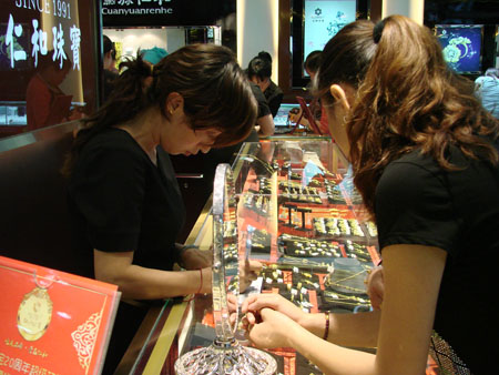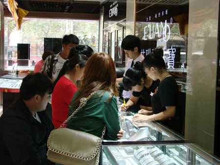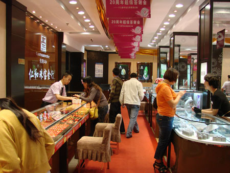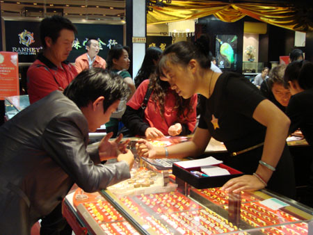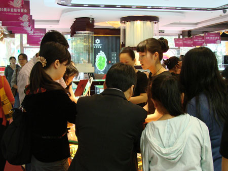 翡翠柜台挑选的顾客络绎不绝