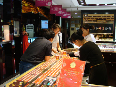 导购员为顾客所挑选的黄金首饰开单