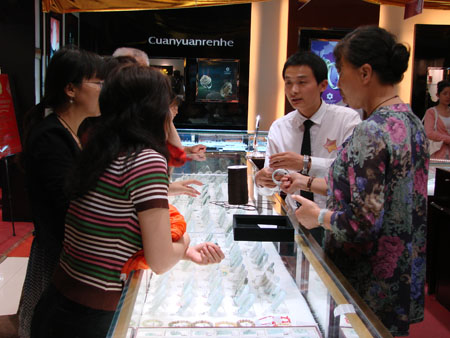导购员为顾客介绍翡翠的鉴别方法
