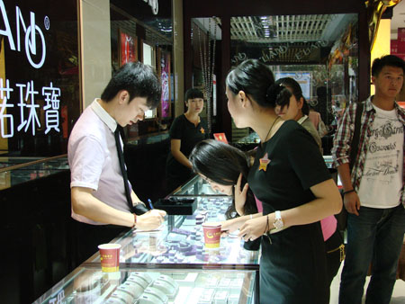 导购员为顾客所挑选的钻石首饰开单